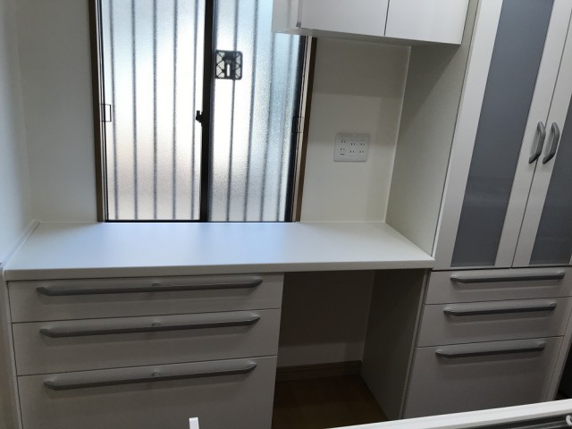 サイドに収納棚がついた三面鏡の化粧台。もちろん鏡の部分は全面収納になっています。
